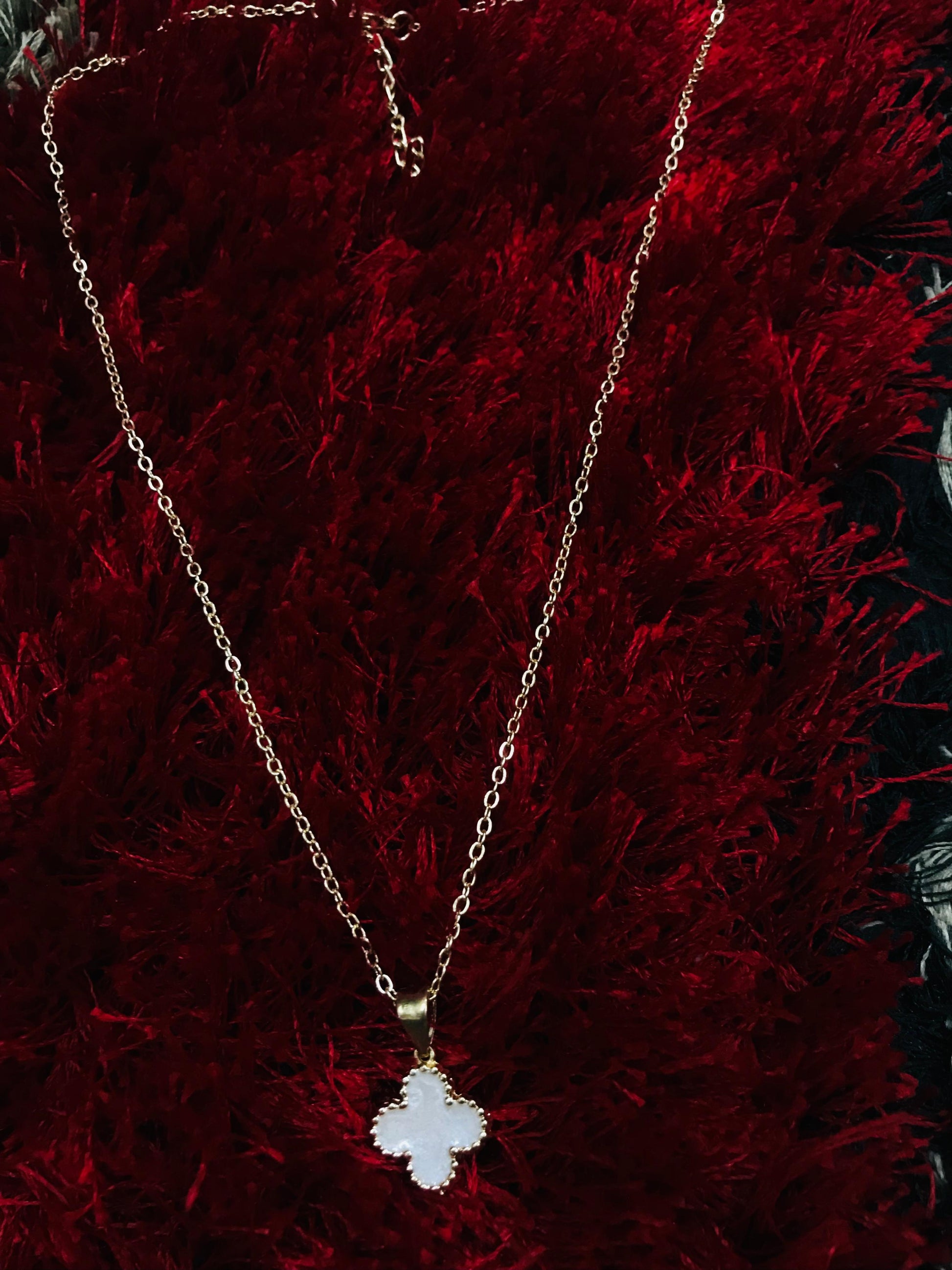 Elevate your jewelry collection with this stunning reversible clover pendant necklace. Designed for versatility and elegance, the pendant features a graceful clover motif that can be worn on either side—glossy black on one, and classic white on the other. Framed in a textured gold-tone border and suspended on a delicate gold chain, this piece effortlessly blends sophistication with everyday charm.